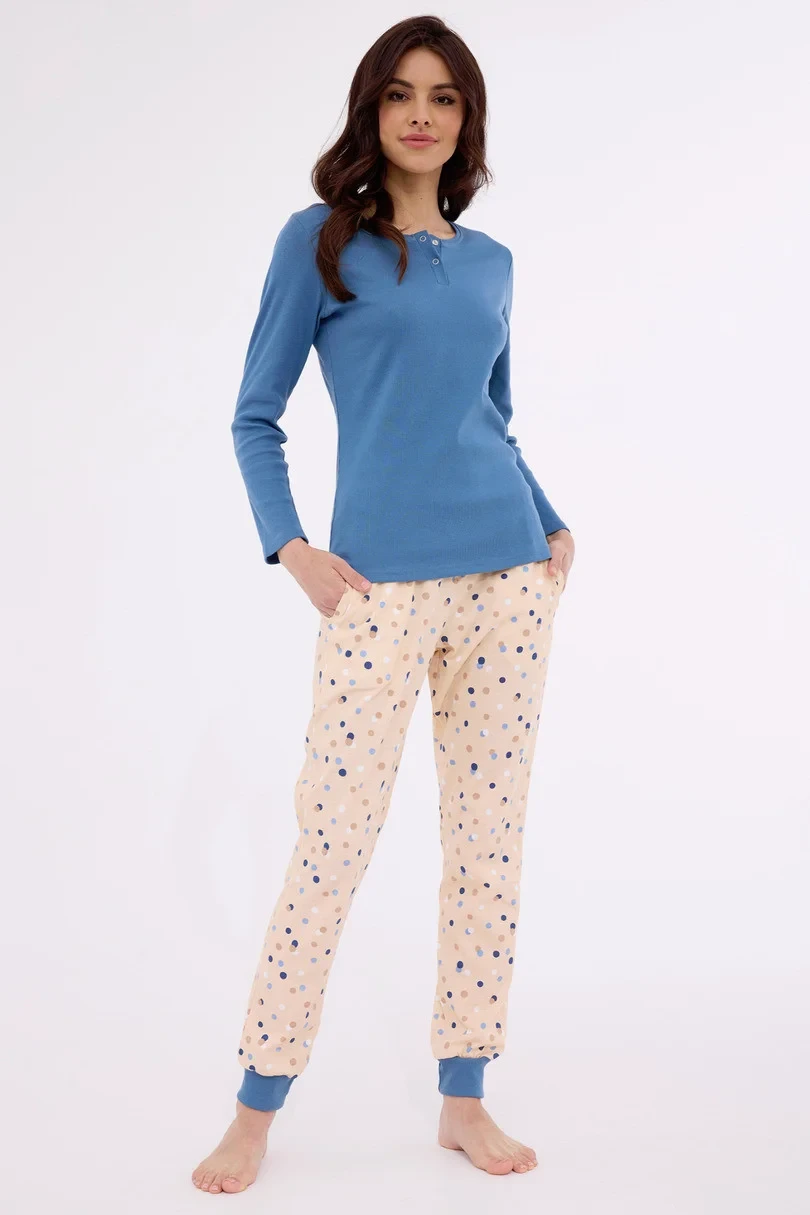 Dámské pyžamo s dlouhými rukávy, žebrovaná halenka, výstřih se zapínáním na patentky, vzorované dlouhé kalhoty s kapsami, nohavice zakončené lemem, baleno v krabici.