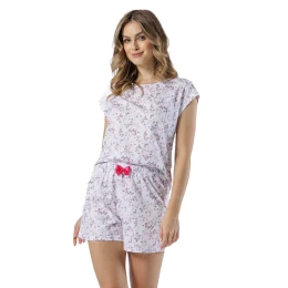 Dámské pyžamo s krátkým rukávem, vyrobené z bavlny v drobných kvítcích. Kulatý výstřih. Krátké šortky, ozdobná mašle v pase.