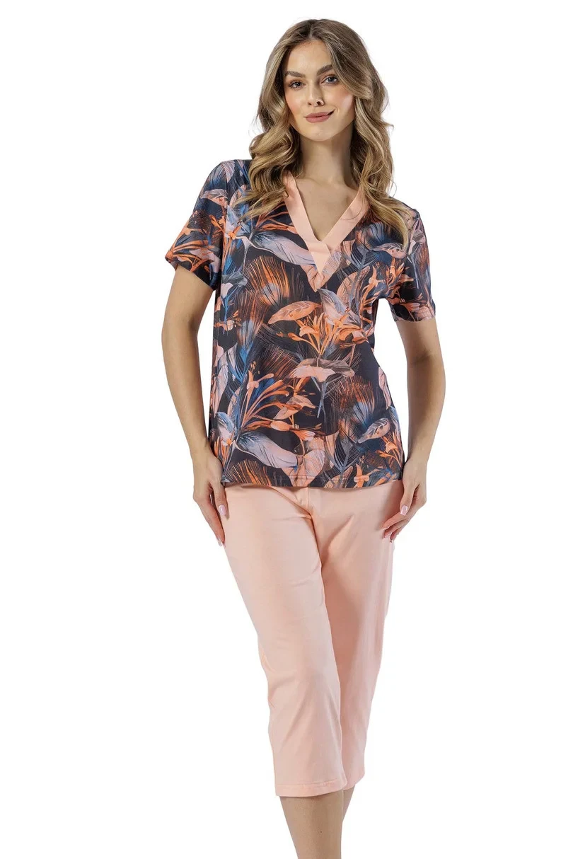 Dámské pyžamo s krátkými rukávy z květované bavlny, s výstřihem a kontrastními kalhotami ve 3/4 délce.