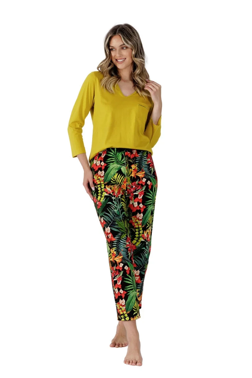 Dámské pyžamo se 7/8 rukávy z jemné bavlny, malým výstřihem, kapsou na hrudi a 7/8 vzorovanými kalhotami.