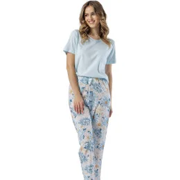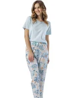 Dámské pyžamo s krátkým rukávem, vyrobené z bavlny, kulatý výstřih, hladké, náprsní kapsa, vzorované 7/8 dlouhé kalhoty s ozdobnou mašlí v pase.