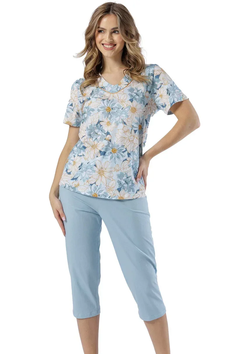 Damska piżama Izaura 1586 Leveza to połączenie elegancji, wygody i najwyższej jakości materiałów. Bluzka wykonana z uszlachetnionej bawełny jest wyjątkowo miękka i delikatna dla skóry. Dekolt w serek ozdobiony subtelną atłasową lamówką nadaje jej stylowego charakteru. Spodnie o długości 3/4, wykonane w 100% z bawełny, zapewniają swobodę ruchów i komfort podczas snu. Całość utrzymana jest w pięknym odcieniu morskiego lazuru, który podkreśla kobiecy styl.