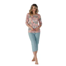 Dámské pyžamo s 3/4 dlouhými rukávy ze vzorované bavlny, kulatý výstřih. Součástí kompletu jsou pevné 3/4 dlouhé kalhoty.