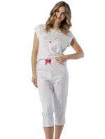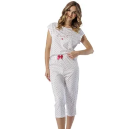 Dámské pyžamo s krátkými rukávy, vyrobené z jemné bavlny. Kulatý výstřih, jemný potisk na úrovni prsou. 3/4 délky kalhot s ozdobnou mašlí v pase.
