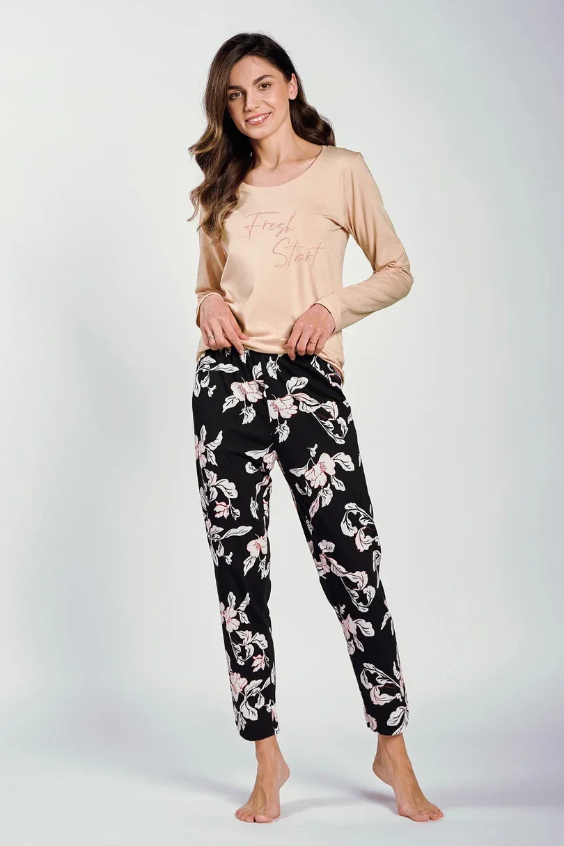 Dámské pyžamo s dlouhými rukávy, vyrobené z jemné bavlny. Kulatý výstřih, přední díl zdobený potiskem. Dlouhé vzorované kalhoty.