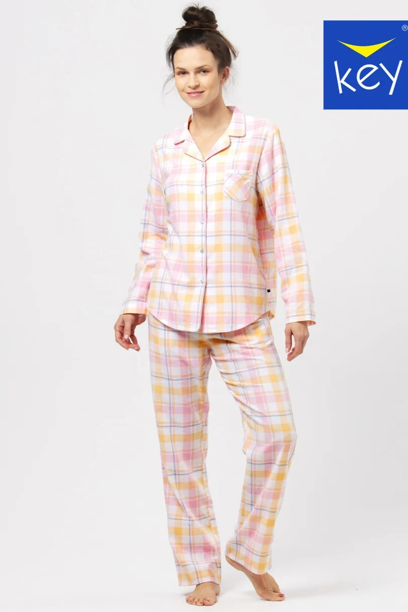 Piżama damska z bawełnianej flaneli w kratkę ozdobiona połyskującą nitką. Bluza z długim rękawem, rozpinana z kłołnierzykiem. W komplecie długie spodnie