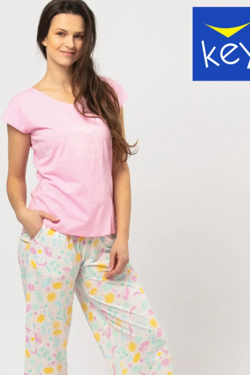 Dámské bavlněné pyžamo. Ideální na léto, tričko s krátkým rukávem, kalhoty pod kolena s barevným potiskem.