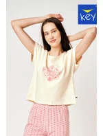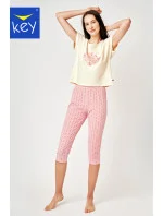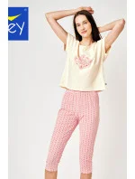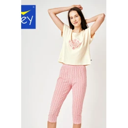 Dámské bavlněné pyžamo. Síťované kalhoty s jemným potiskem, hladké tričko s krátkým rukávem a motivem na přední straně.