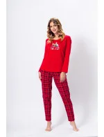 Výrazné dámské pyžamo z jemné bavlny. Tričko s dlouhými rukávy zdobené potiskem, půlkulatý výstřih. Doplněno dlouhými vzorovanými kalhotami.