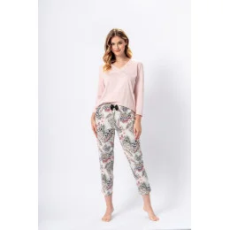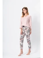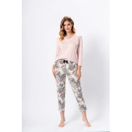Pokud jste příznivci decentních módních řešení a zvířecích potisků, tento návrh vás jistě osloví. Dámské pyžamo Cecylia je exkluzivní prémiový model a zaručuje to, co slibuje - maximální pohodlí při spánku! Pyžamo má 7/8 rukávy a výstřih uspořádaný do špičatého tvaru, navíc zdobený drobnou mašličkou. Blůza byla upletena v nádherném světle růžovém odstínu a v kombinaci s kalhotami ve velkých květinových barvách s akcenty leopardího vzoru opravdu zaujme. Součástí jsou 7/8 kalhoty zdobené kontrastní saténovou mašlí, díky níž je komplet elegantní a osobitý. Je vyrobena s použitím mimořádně měkké, rafinované 100% bavlny, která zajišťuje dobrou cirkulaci vzduchu a pohodlí. Pyžamo Cecylia je návrhem, který se umí odlišit od ostatních pyžam. Rozhodně ho musíte mít!