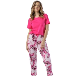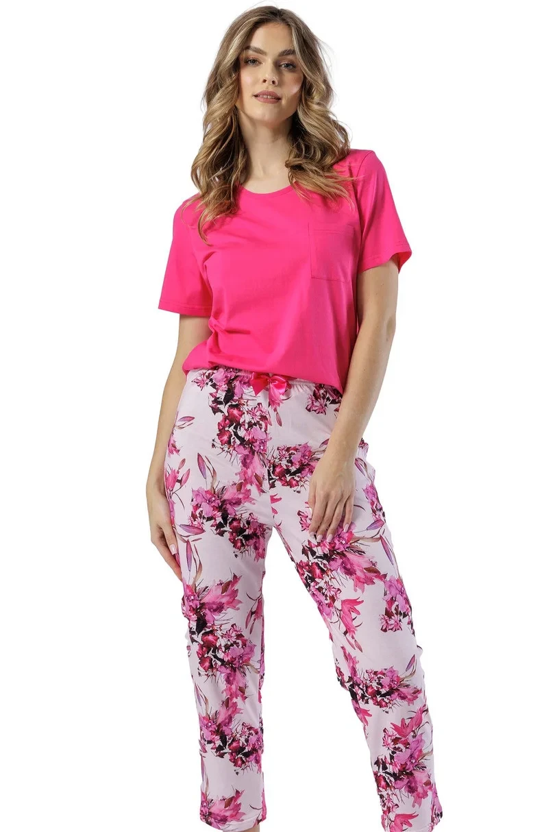 Dámské pyžamo s krátkým rukávem, vyrobené z bavlny, kulatý výstřih, hladké, náprsní kapsa, vzorované 7/8 dlouhé kalhoty s ozdobnou mašlí v pase.