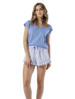 Dámské pyžamo s krátkými rukávy, vyrobené z jemné bavlny, s výstřihem, vzorovanými krátkými kalhotami s nařasenými nohavicemi a ozdobnou mašlí v pase.