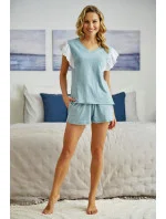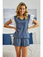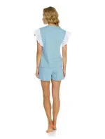 Dámské pyžamo s krátkým rukávem ušité z kvalitní 100% bavlny. Výstřih, halenka zdobená výraznou krajkou. Krátké šortky s kapsami. Zářezy na bocích.