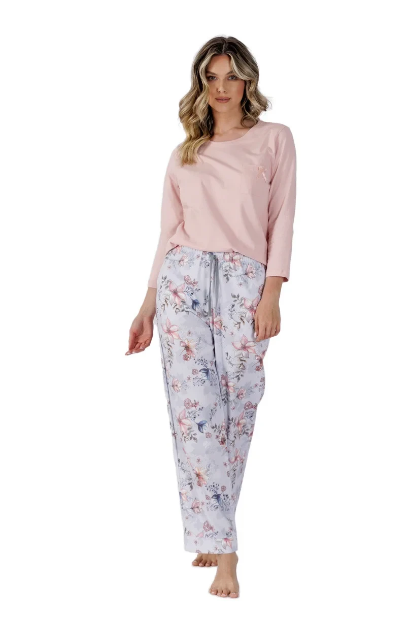 Dámské pyžamo se 7/8 dlouhými rukávy, pevné, s kulatým výstřihem, ozdobnou kapsou na hrudi, vzorovanými kalhotami s dlouhými nohavicemi.