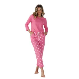 Dámské pyžamo z jemné bavlny. 7/8 rukávy, kulatý výstřih, ozdobná kapsa na prsou. 7/8 vzorované kalhoty s kapsami.