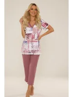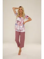 Dámské pyžamo s krátkými rukávy ze vzorované viskózy s přídavkem elastanu, doplněné pevnými kalhotami s 3/4 délkou.