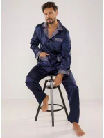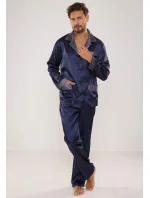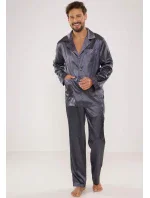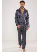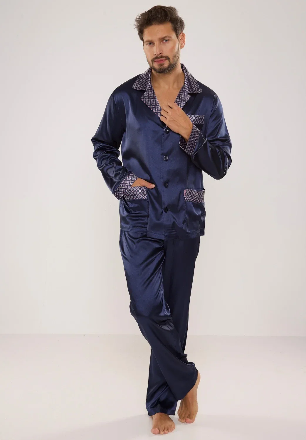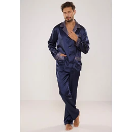 Blůza pyžama má límec, kapsy a rozepíná se. Dlouhé jednobarevné kalhoty mají na bocích dvě kapsy. Manžety, límec a kapsy jsou ozdobené vzorovaným materiálem.