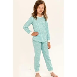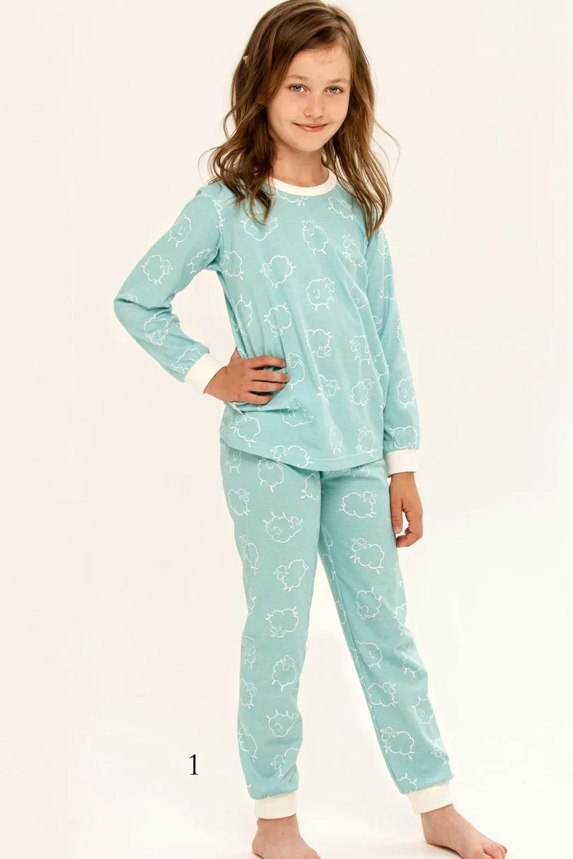Dívčí pyžamo z měkké bavlny, vzorované tričko s dlouhými rukávy, dlouhé vzorované kalhoty s žebrovanými manžetami a nohavicemi