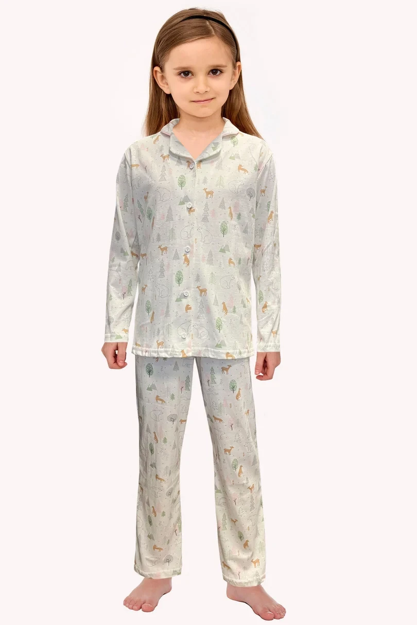 Dívčí pyžamo s dlouhými rukávy a dlouhými kalhotami, rozepnuté.