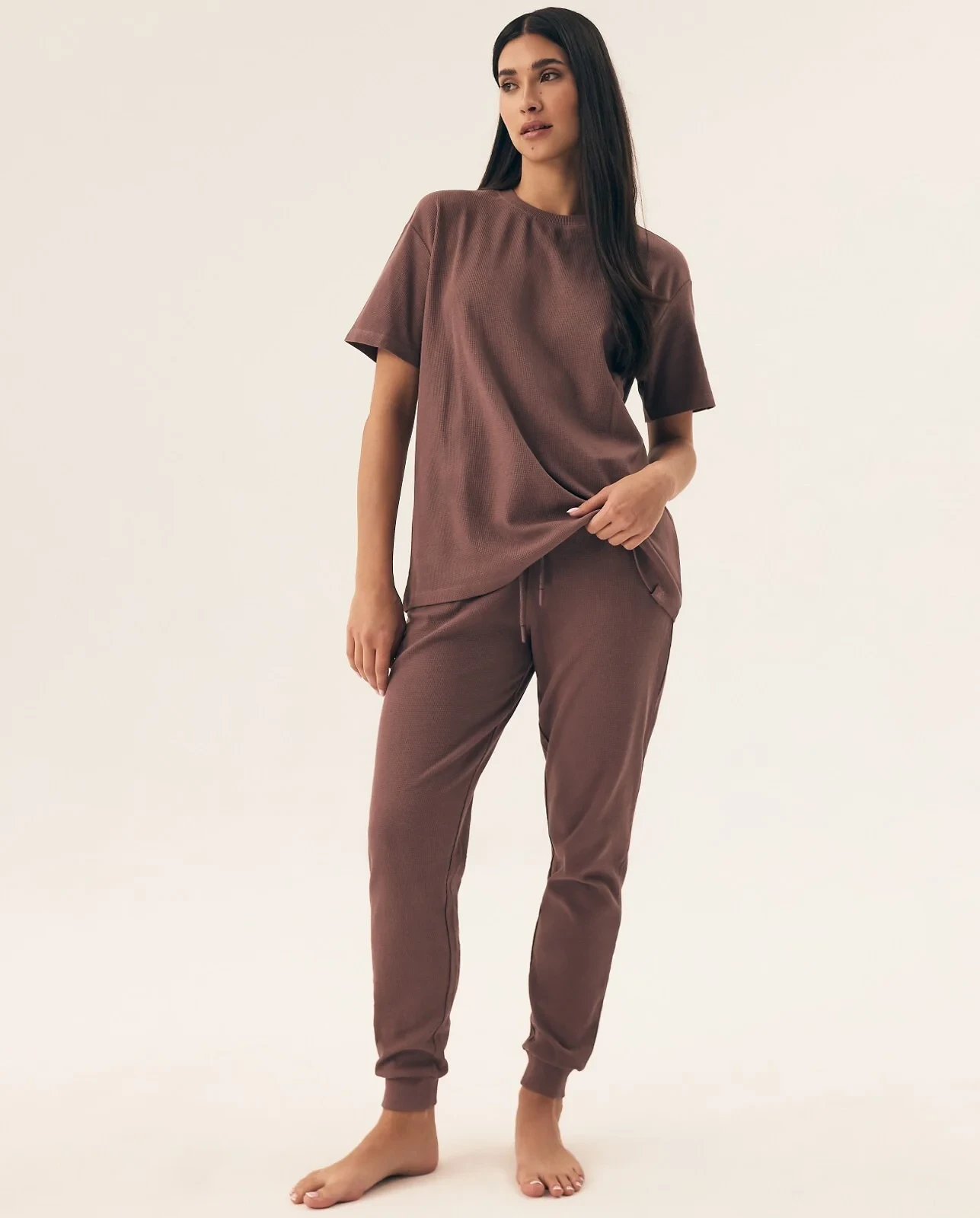 - široký elastický pas lemovaný žebrovaným úpletem se stahovací šňůrkou pro úpravu obvodu pasu