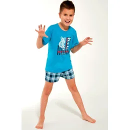 Bavlněné chlapecké pyžamo, tričko s krátkým rukávem zdobené potiskem, kostkované šortky v ceně. Pyžamo balené ve fólii.