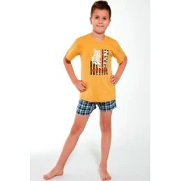 Bavlněné chlapecké pyžamo, tričko s krátkým rukávem zdobené potiskem, kostkované šortky v ceně. Pyžamo balené ve fólii.