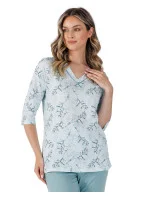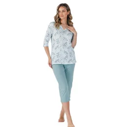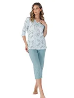 Zachovejte si pohodlí a eleganci i během spánku s tímto dámským pyžamem 388 J/25 ze 100% kvalitní bavlny. Košile s květinovým potiskem na knoflíky zaujme decentním stylem a pohodlím. 3/4 rukávy a praktické boční kapsy činí pyžamo funkčním a ideálním i pro domácí relaxaci. Komplet doplňují hladké kalhoty v rybářském stylu s elastickým pasem pro volnost pohybu a pohodlí.