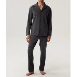 Poznaj idealną piżamę dla fanów klasycznych krojów. W skład męskiej piżamy w kolorze ciemno-szarym wchodzi zapinana na guziki góra o koszulowym charakterze, z długimi rękawami i dekoltem w kształcie litery V oraz długie spodnie z prostymi nogawkami.