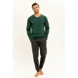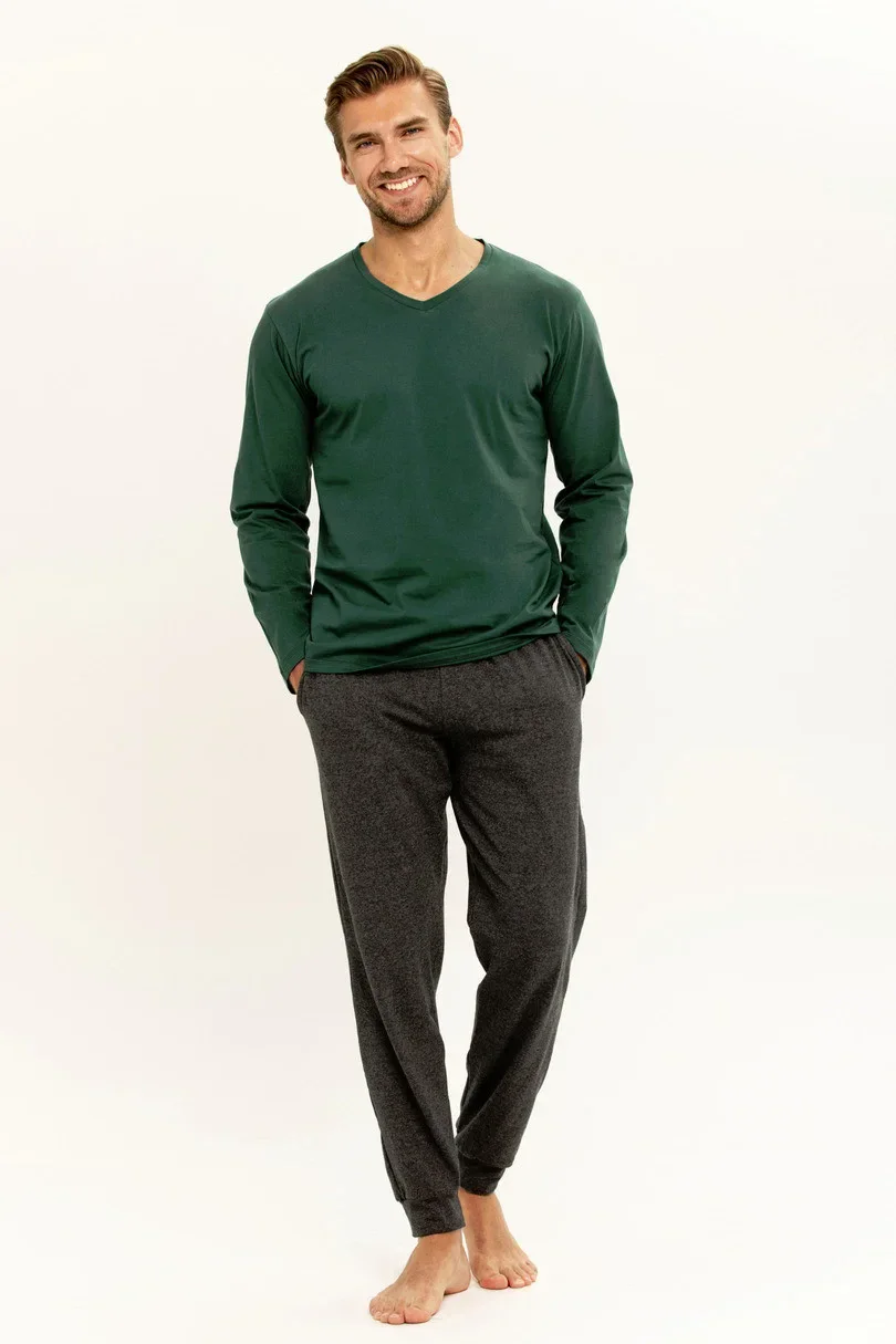 Pánské pyžamo s dlouhými rukávy, jednoduchým výstřihem, melírovanými dlouhými kalhotami s kapsami, nohavice zakončené švem.