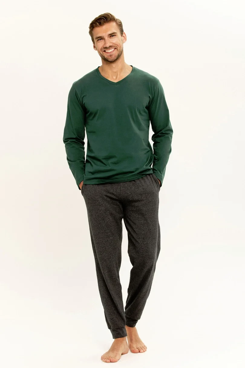 Pánské pyžamo s dlouhými rukávy, jednoduchým výstřihem, melanžovými dlouhými kalhotami s kapsami, nohavice zakončené švem.