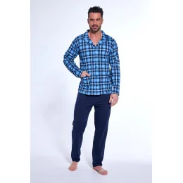 Elegantní pánské pyžamo s dlouhými rukávy a límcem, otevřený límec, kapsy na úrovni boků. Pevné kalhoty s rovnými dlouhými nohavicemi. Pyžamo balené v krabici.