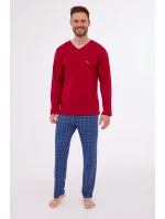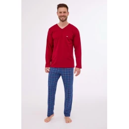 Pánské pyžamo z vysoce kvalitní bavlny, blůza s dlouhým rukávem a výstřihem do V, malá kapsička na hrudi, dlouhé rovné kalhoty s kostkovaným vzorem, baleno v krabici.