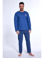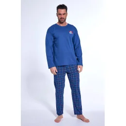 Pánské pyžamo z kvalitní bavlny. Blůza s dlouhými rukávy, kulatý výstřih, jemný potisk na prsou, dlouhé rovné kalhoty s kostkovaným vzorem, baleno v krabici.