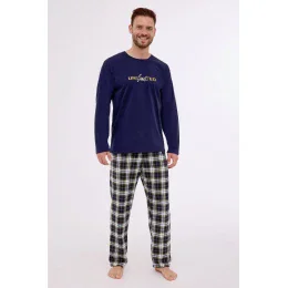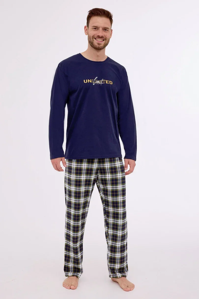 Pánské pyžamo z vysoce kvalitní bavlny, blůza s dlouhými rukávy a kulatým výstřihem, jemný potisk na hrudi, dlouhé rovné kalhoty s kostkovaným vzorem, baleno v krabici.