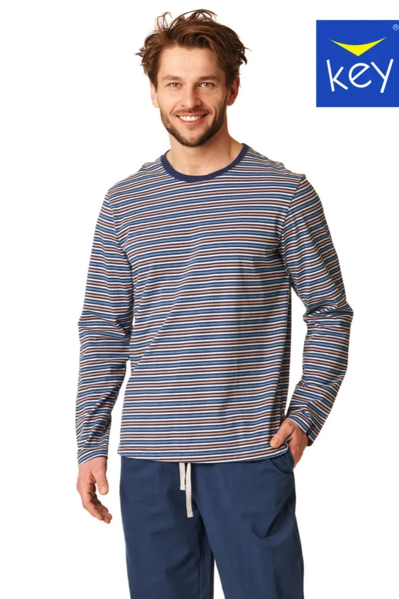 Pánské bavlněné pyžamo. Košile s dlouhými rukávy a pletenými pruhy, kalhoty v tmavě modré barvě.
