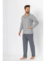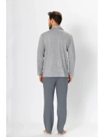 Klasické pánské pyžamo bez knoflíků. Vrchní díl pyžama ve světlé barvě s jemným tištěným vzorem. Blůza má tři praktické kapsy lemované kontrastním lemem. Saténové lemování v barvě kalhot podtrhuje elegantní charakter tohoto pyžama. Dlouhé kalhoty s rovným, volným střihem.
