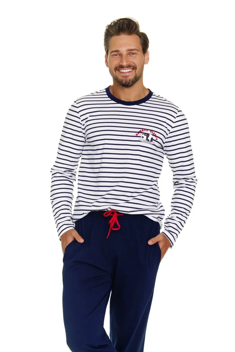 Pánské pruhované pyžamo s dlouhými rukávy a jemným potiskem v oblasti hrudníku, doplněné pevnými dlouhými kalhotami s rovnými nohavicemi a kapsami.