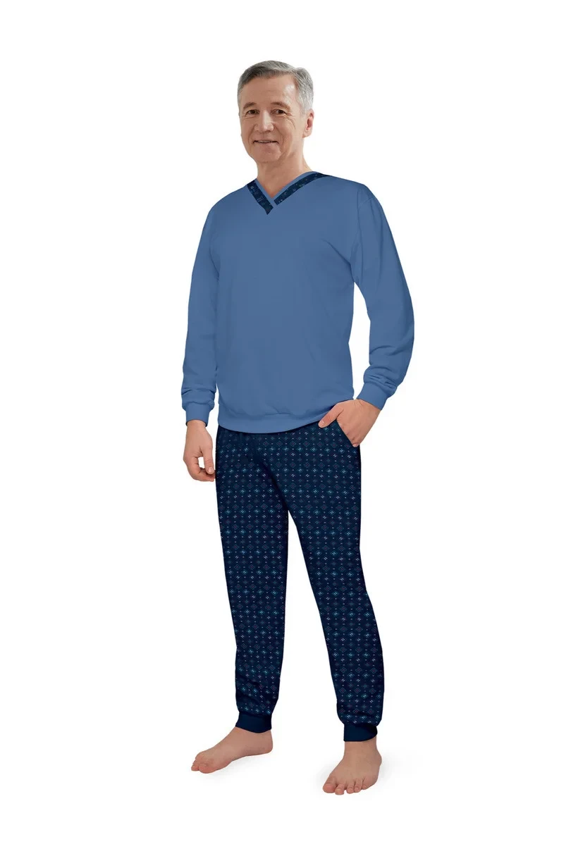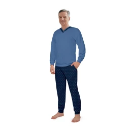 Pánské pyžamo s dlouhými rukávy, vyrobené z bavlny, s výstřihem, vzorovanými kalhotami s kapsami a dlouhými nohavicemi se stahovacím lemem.