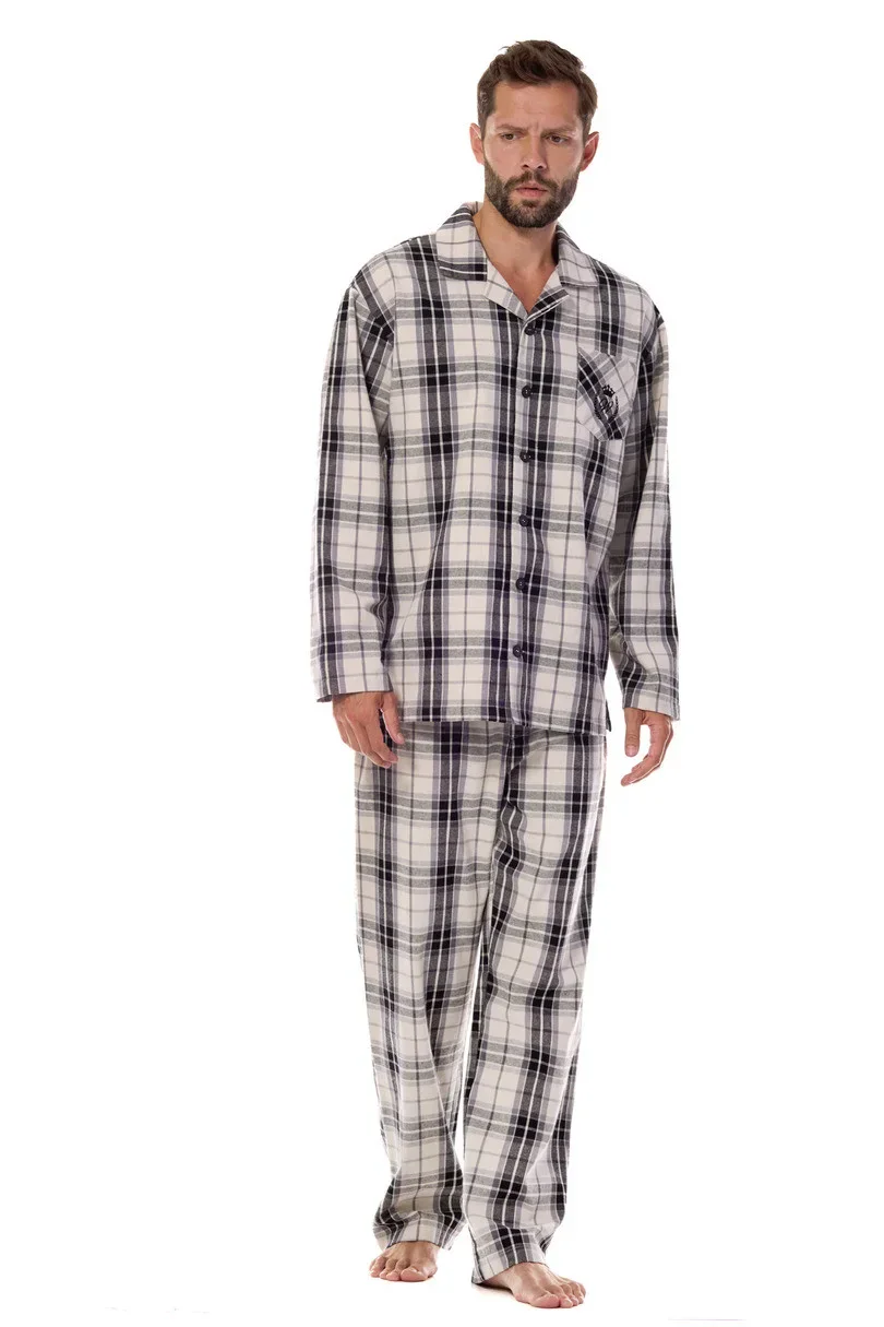Klasické pánské pyžamo s dlouhými rukávy a límcem, zapínání na zip. Z hřejivého flanelu, jemná výšivka na hrudi, dlouhé kalhoty s rovnými nohavicemi a kapsami.