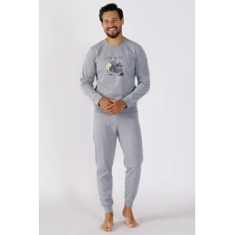 Pánské pyžamo z kvalitní, měkké, melanžové bavlny, tričko s dlouhými rukávy a potiskem na přední straně, dlouhé hladké kalhoty s výstřihem, manžetami a spodním lemem s pohodlnou šňůrkou.