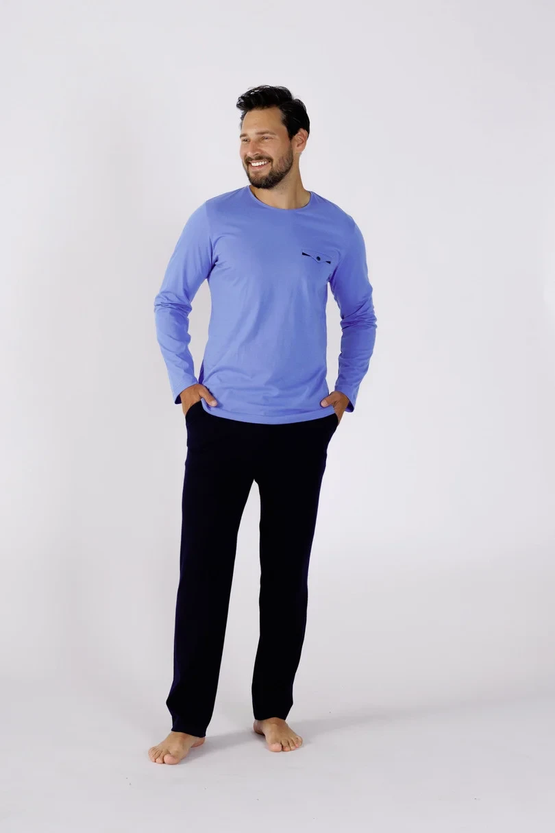 Pánské pyžamo z vysoce kvalitní bavlny. Blůza s dlouhými rukávy, půlkruhový výstřih, kapsa na panáčka na hrudi, dlouhé rovné kalhoty.