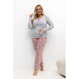 Dámský pyžamový set plus size je pohodlná dvoudílná sada vytvořená s ohledem na maximální pohodlí a ženský styl. Součástí je tričko s dlouhým rukávem a dlouhé kalhoty s rovnými nohavicemi. Vrchní část pyžama má kulatý výstřih a tři knoflíky vpředu, které dodávají jemný dekorativní akcent. Na spodním okraji trička je praktická kapsa, která přidává trochu funkčnosti a celkově dává outfitu ležérní charakter. Kalhoty jsou zdobeny dominujícím květinovým vzorem, který dodává sadě lehkost a ženský šarm. Rovné nohavice zaručují pohodlí a volnost pohybů, ideální jak pro večerní relaxaci, tak i pro pohodlný spánek.