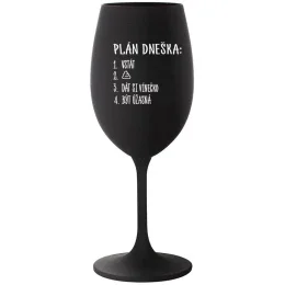 Vinná černá sklenice s originálním motivem PLÁN DNEŠKA - VSTÁT je krásným a osobitým dárkem, které ale využijete i Vy sami třeba ve chvílích, kdy si budete chtít zpříjemnit náročný den. Tyto originální vinné sklenice jsou totiž nejen pro výjimečné události, ale i pro běžné večery, které si chcete zpříjemnit sklenkou dobrého vína. Jistě proto potěší každého milovníka vína, i toho, kdo si umí svůj život vychutnat plnými doušky.