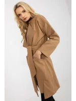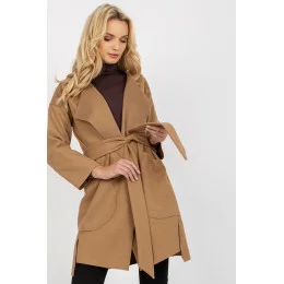 Tenký dámský kabát s dlouhými rukávy, bez podšívky. Kabát bez zapínání, s páskem na zavázání. Velké kapsy na bocích.