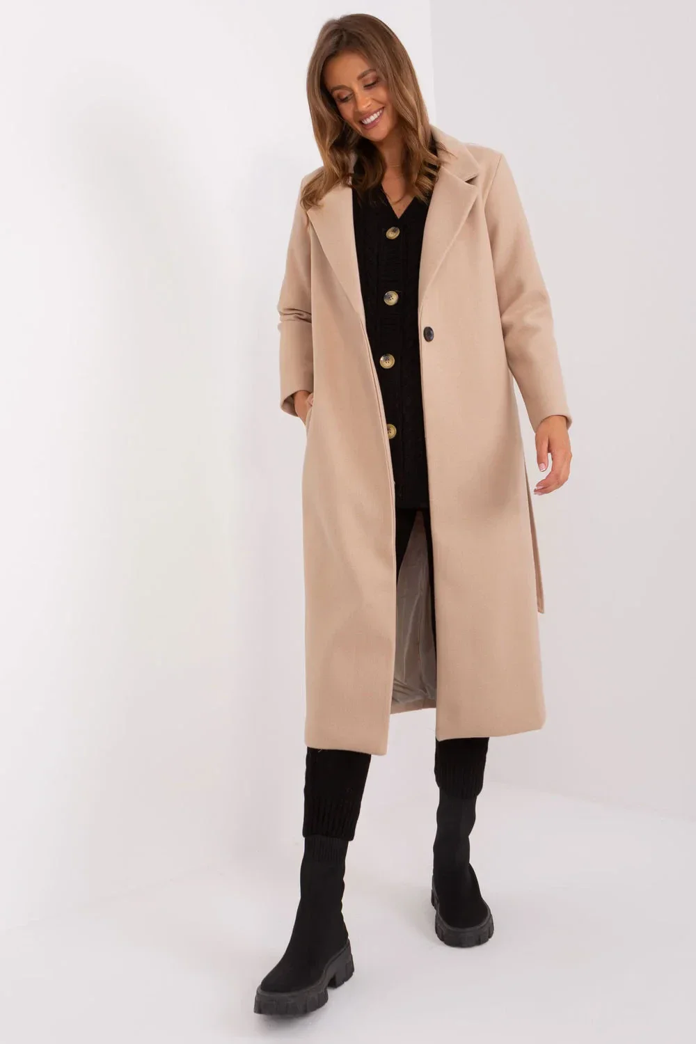 Tento dlouhý přechodný kabát je ideální pro různé příležitosti, od neformálních až po slavnostnější. Je vyroben z odolného polyesteru, který zaručuje dlouhou životnost a pohodlné nošení. Dlouhý střih poskytuje vynikající ochranu před chladem a větrem a nakládané kapsy jsou praktické i stylové. Kabát je navržen v klasickém jednobarevném vzoru, takže je univerzální a hodí se pro mnoho vzhledů. Díky absenci zateplení je vhodný na podzim a jaro. Zapínání na knoflíky a pásek na zavázání dodávají kabátu elegantní vzhled, který se hodí jak pro běžné, pracovní, tak i formálnější příležitosti. Tento kabát, vyrobený ze 100% polyesteru, je vynikající volbou pro každé roční období.