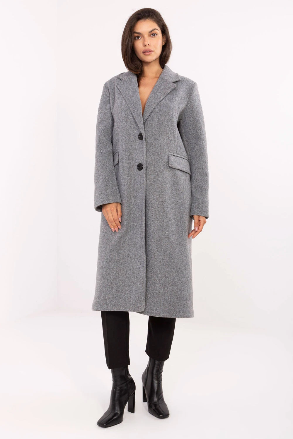 Elegantní dlouhý dámský kabát je nadčasový model, který se skvěle hodí jak na každý den, tak do pracovních stylizací nebo na slavnostní příležitosti. Vyrobený z polyesteru s hladkou strukturou materiálu vypadá minimalisticky a elegantně, zdůrazňuje klasický charakter. Kabát má vestavěné polštářky na ramenou, které dávají siluetě výraznou linii a elegantní střih. Otevřené klopy a jednořadé zapínání na knoflíky zdůrazňují jeho nadčasový střih. Model je vybaven podšívkou a praktickými kapsami pod patkami, které doplňují celkový dojem. Je to lehký, přechodný kabát, skvělý na podzim, zimu a jaro, ideální volba pro ženy, které ocení klasiku v moderním provedení.