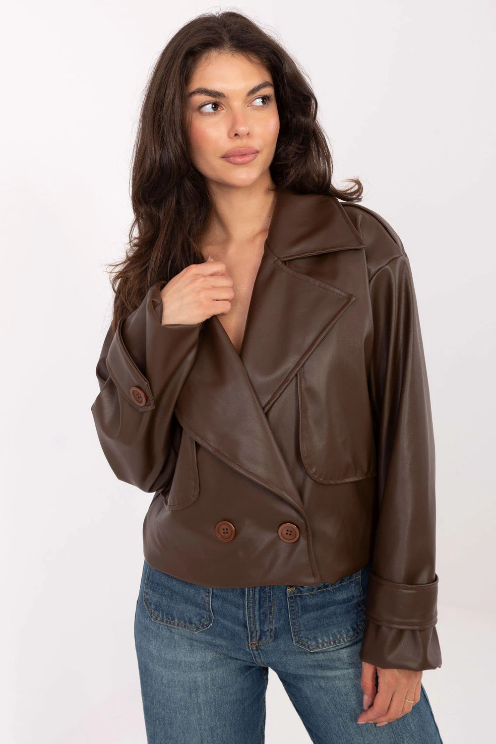Krátký dámský trenčkot z ekokůže je moderní interpretací klasiky, ideální jako přechodný kabát na podzim, zimu, jaro. Vyrobený z vysoce kvalitní směsi polyesteru a polyuretanu, vyniká hladkou fakturou a elegantním, zároveň ležérním stylem, skvěle se hodícím do každodenních stylizací. Model byl navržen s velkým límcem a širokými límci, které mu dodávají charakter. Dvojřadé zapínání na knoflíky zdůrazňuje klasický střih, a náramky na ramenech vnášejí vojenskou notu typickou pro trenčkot. Kabát má také podšívku, co zvyšuje pohodlí nošení a dělá celkový vzhled mimořádně pečlivým. Krátká délka a jednoduchý střih dělají z tohoto modelu univerzální kousek šatníku, ideální pro každodenní, městské stylizace s nádechem elegance.