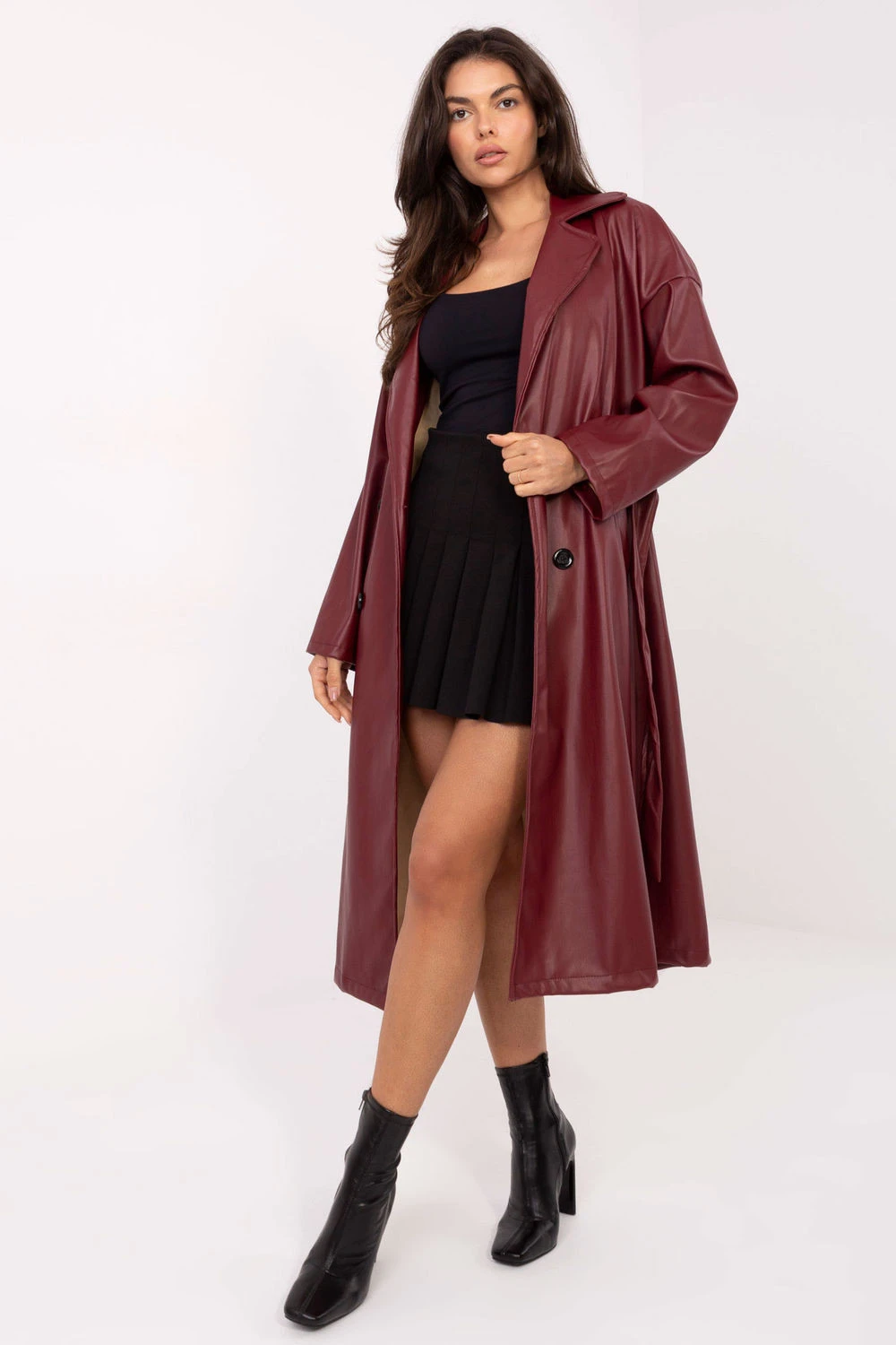 Dámský kožený kabát s nadčasovým, ležérním charakterem, ideální jako přechodný vrchní oděv na podzim, zimu a jaro. Vyrobený z vysoce kvalitní směsi polyesteru a polyuretanu, vyniká hladkou fakturou a elegantním vzhledem. Model po kolena byl navržen s důrazem na detaily: má klasické skládané límce, kapsy na zip a dlouhé rukávy. Dvouradé zapínání na knoflíky mu dodává eleganci, a pásek na uvázání v pase umožňuje zdůraznit postavu a přizpůsobit střih vlastním preferencím. Lehký, nevyztužený, skvěle se hodí do každodenních outfitů, kombinující pohodlí s módním, nadčasovým designem. Jedná se o univerzální kabát, který přidá eleganci každému outfitu.
