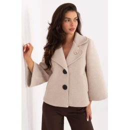Krátký elegantní dámský kabát, ideální na přechodné období podzim, zima a jaro. Vyrobený z vysoce kvalitní směsi polyesteru, viskózy a elastanu, vyznačuje se hladkou strukturou a pohodlným nošením. Model s límci, zapínán jednořadě na knoflíky, má praktické kapsy. 3/4 rukávy dodávají lehkost a ozdobná brož na límci zdůrazňuje elegantní styl. Bez podšívky, skvěle se hodí do každodenních i pracovních stylizací.