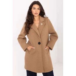 Elegantní dámský kabát vyrobený z moderní pěnové látky, ideální na přechodné období podzim, zimu a jaro. Vyrobena z polyesteru, viskózy a elastanu, ohromuje hladkou strukturou a odolností. Model standardní délky s límci, zapínáním na knoflíky, dlouhými rukávy a praktickými kapsami. Stylovým doplňkem je ozdobná brož na límci, která dodává celku jedinečný charakter. Lehký a nezateplený, skvěle se hodí do každodenních i pracovních stylizací.